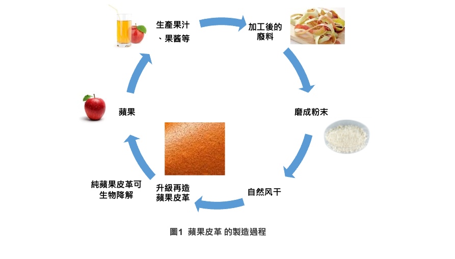 從製造蘋果果汁、果醬等加工後的廢料如果渣和果皮製成。其製造工序是首先將回收的蘋果皮清潔、烘乾、磨成粉末後或與其他天然纖維混合,或通過與聚氨酯(PU)混合,跟著塗在純棉面料上,再壓制皮紋、烘乾等工序(如圖1),製造比較耐用、環保、透氣的仿皮,觸感光滑,現時生產商正著手採用可生物降解的PU來取代一般合成PU、有機/生物色素等來令蘋果皮革更純素及環保材料。蘋果皮革特點包括:(一)使用生物基廢棄,減少廢物處理及碳排放、(二)原料沒有取材於動物、(三)因性能不上動物皮革,尚未廣泛被應用、(四)售價比動物皮革平宜。