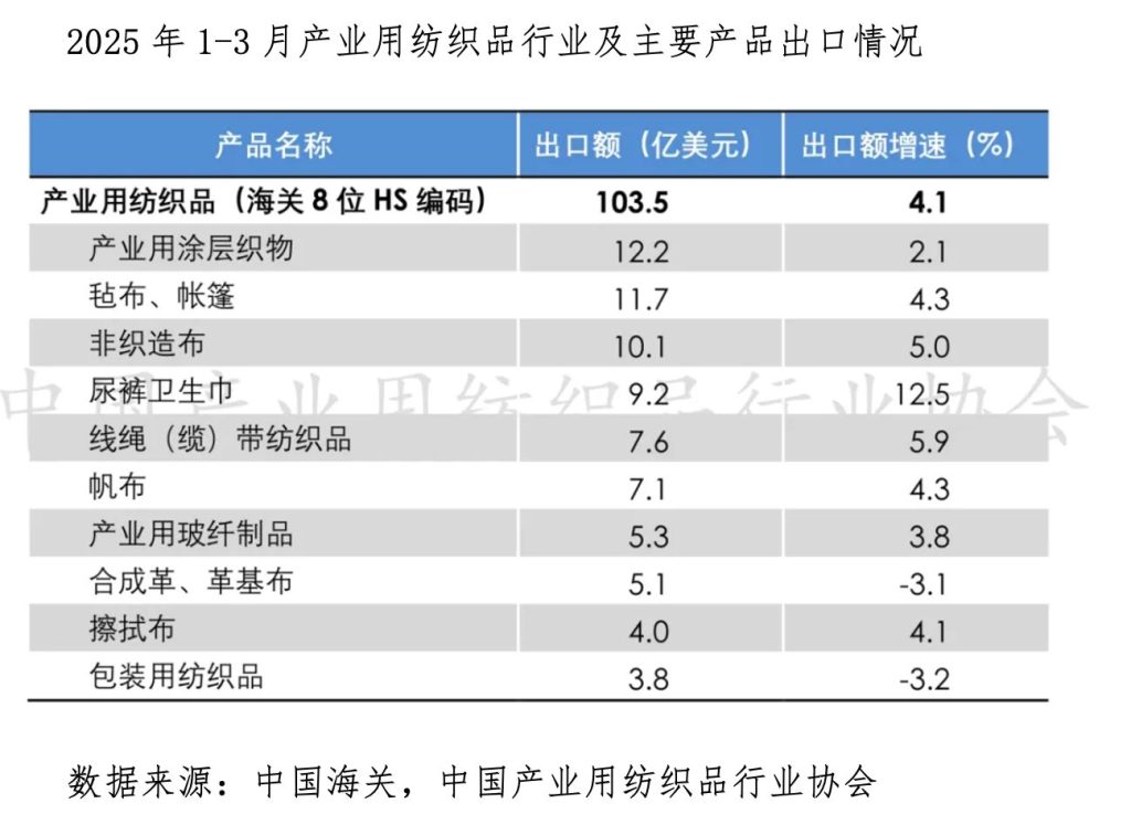 国际贸易方面,根据中国海关数据(海关8位HS编码统计数据),2025年1-3月我国产业用纺织品行业的出口额为103.5亿美元,同比增长4.1%;行业进口额为12.6亿美元,同比增长6.7%。