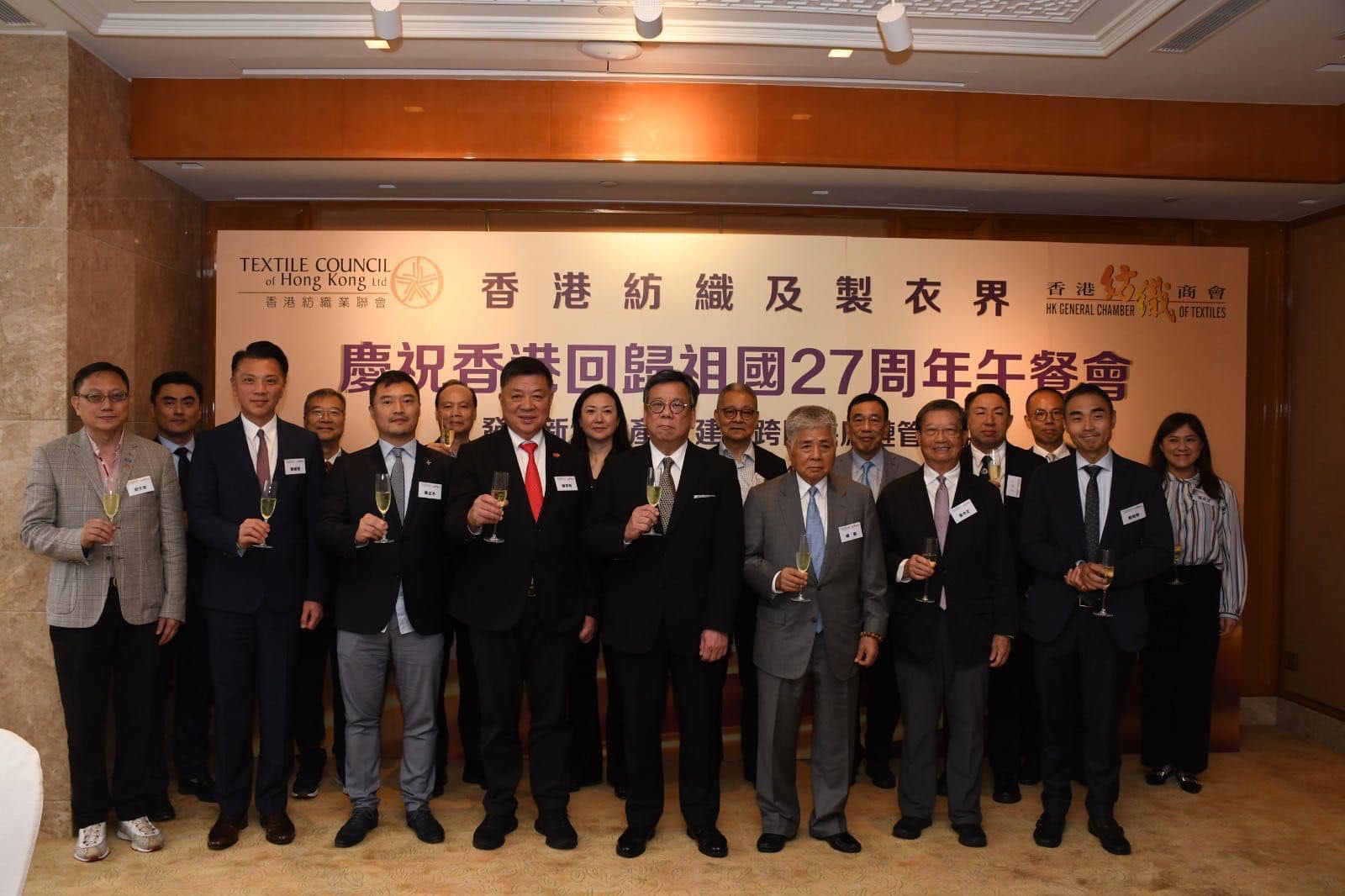 6月24日,本會與香港紡織業聯會舉行了隆重的午餐會,慶祝香港回歸祖國27周年。商務及經濟發展局局長丘應樺先生應邀出席並擔任主禮嘉賓,為業界作了主題為「發展新質生產力 建構跨國供應鏈管理中心」的精彩演講。超過半百名業界主要代表參與了這次盛會,共同討論香港紡織及製衣業的發展新機遇,探索如何把握國家「十四五」規劃帶來的機遇,提升香港在全球供應鏈中的地位和競爭力。作為香港傳統支柱產業之一,紡織及製衣業在香港經濟發展中扮演著重要角色。通過今天的交流,業界領袖們表示將進一步深化與內地的合作,推動產業轉型升級,為香港經濟的長遠發展注入新動力。本會永遠榮譽會長黃守正(前排右二)、陳亨利(前排左四)、榮譽會長楊勳(前排右三)、常務副會長陳祖恒(前排左二)、楊燕芝(後排右一)、監事長呂䏈鳴(後排右三)出席。